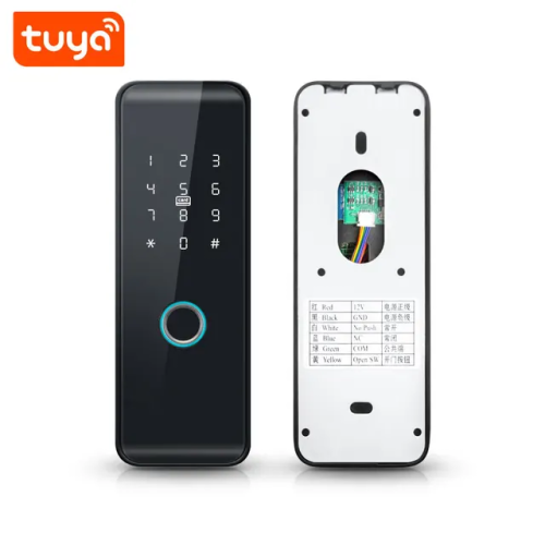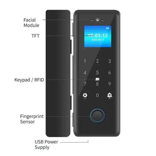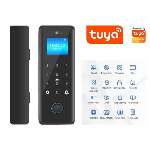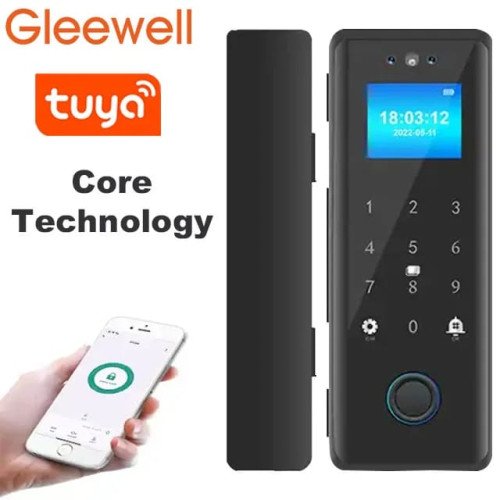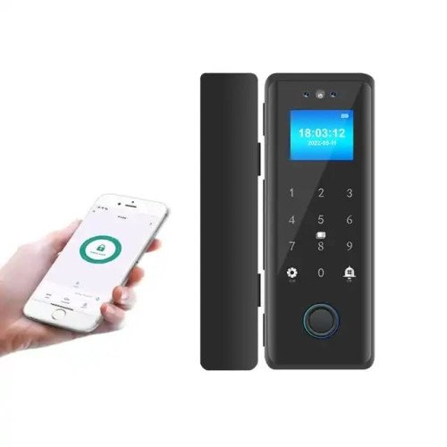 قفل باب زجاجي ذكي مزود ببصمة وجة مع بصمة الأصبع و يمكن التحكم به من خلال الموبايل ابلكيشن كما يمكنك فتحة عن طريق الباسورد أو الكارت أو المفتاح العادي